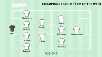Centre-Forward: Another selection that owes a little more to a remarkable statistic than anything of special aesthetic merit, although any hat-trick in the group stage -- even against a weak Dinamo Zagreb -- should be noteworthy. Robert Lewandowski has now scored 10 times in his last three matches and his third goal here, a scoop over the goalkeeper Eduardo, was the finish of a man who feels as if anything he tries will come off at the moment. "A striker like Lewandowski doesn't need any prodding," said his captain Philipp Lahm afterwards. "He could be even more dangerous than last season."